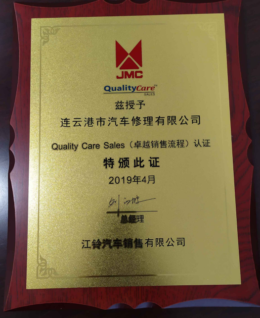 自2018年12月下旬修理公司通過江鈴汽車QCS1.5銷售流程認證以來,2019年4月20日修理公司再獲喜訊,公司順利通過江鈴汽車銷售有限公司QCS(卓越銷售流程)認證。