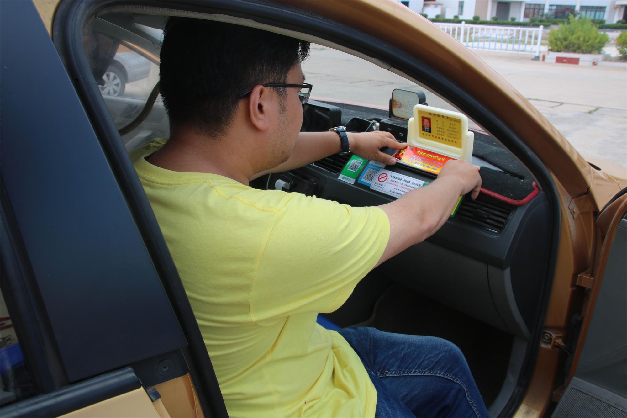 紙質(zhì)服務(wù)監(jiān)督卡安裝于出租車副駕駛座正前方,監(jiān)督卡上除有駕駛員的姓名、照片、車號、所屬公司外,在監(jiān)督卡的底座,還著重標(biāo)注了社會主義核心價值觀內(nèi)容。