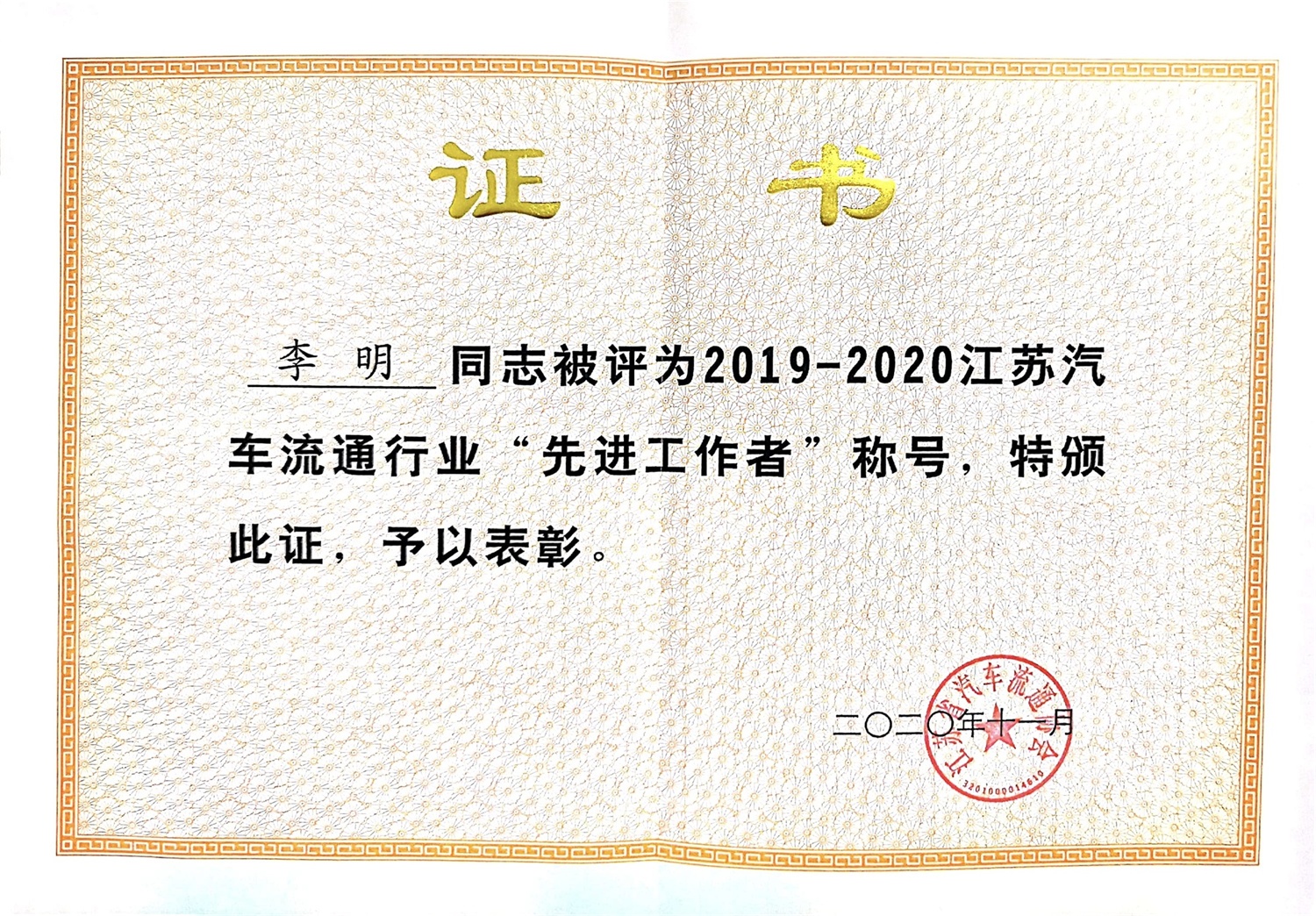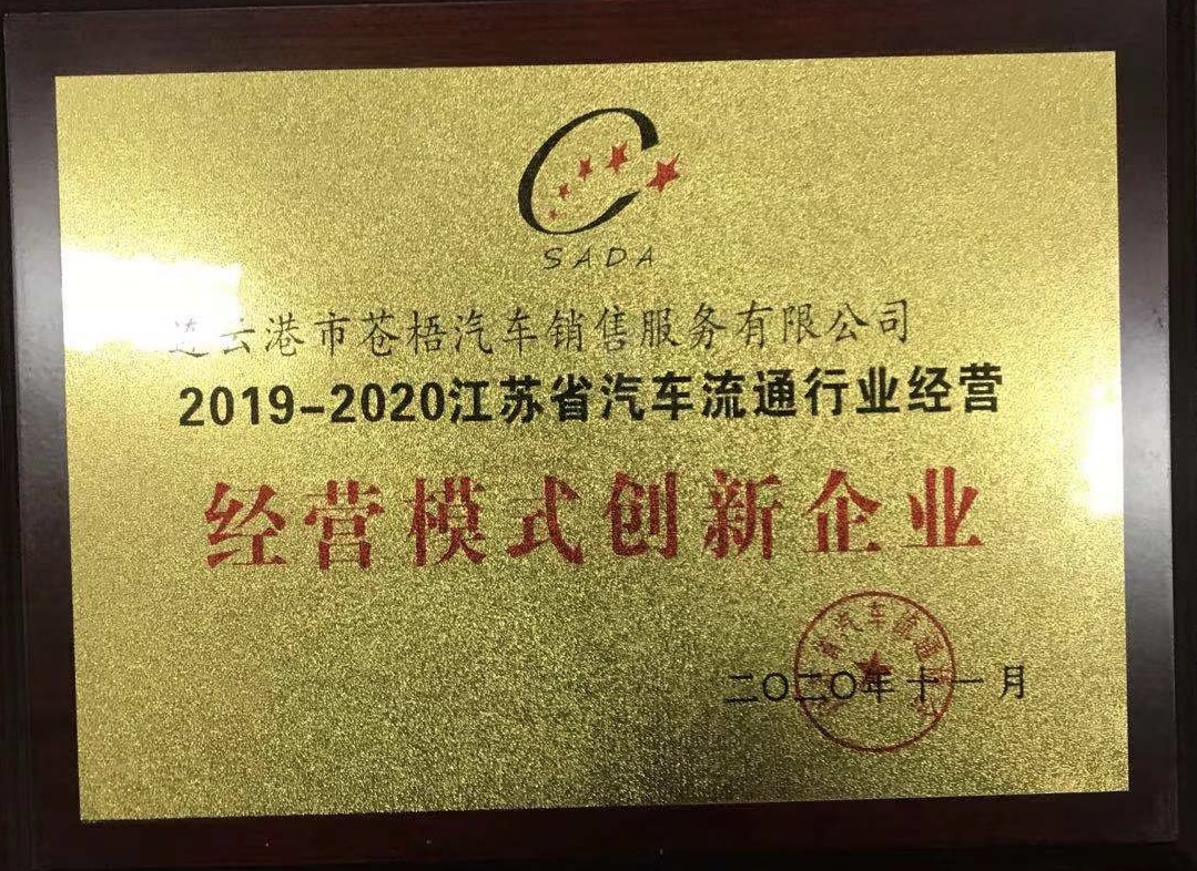 蒼梧銷售公司在此次表彰大會上榮獲2019-2020江蘇省“汽車流通行業(yè)經(jīng)營模式創(chuàng)新企業(yè)”、公司副經(jīng)理李明榮獲2019-2020江蘇省“汽車流通行業(yè)先進(jìn)工作者”稱號。