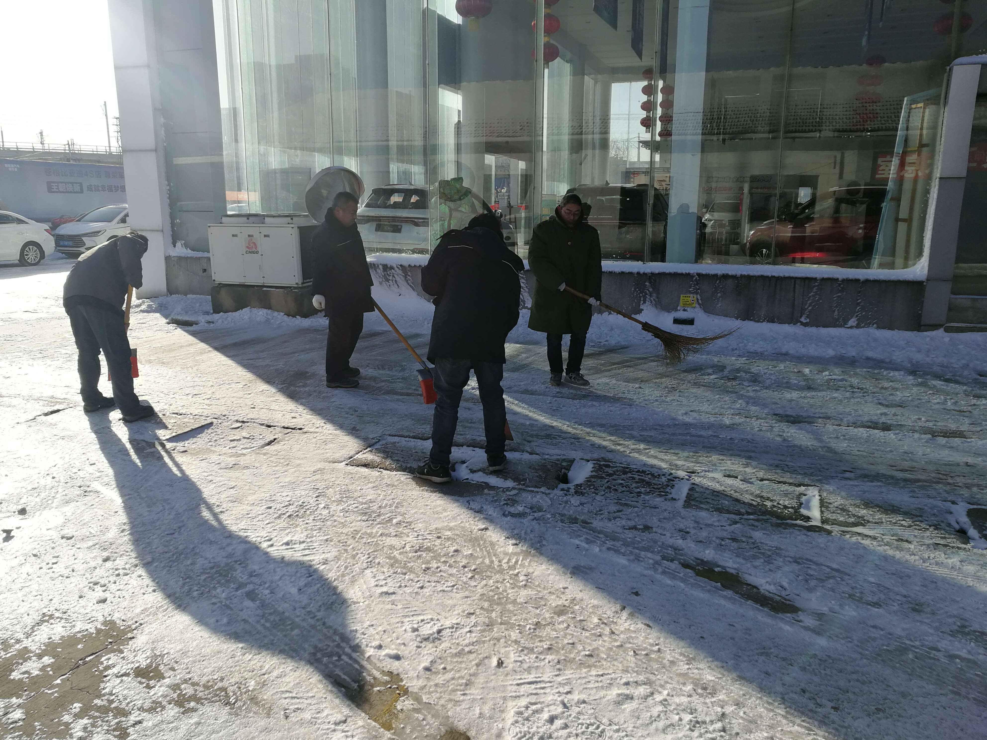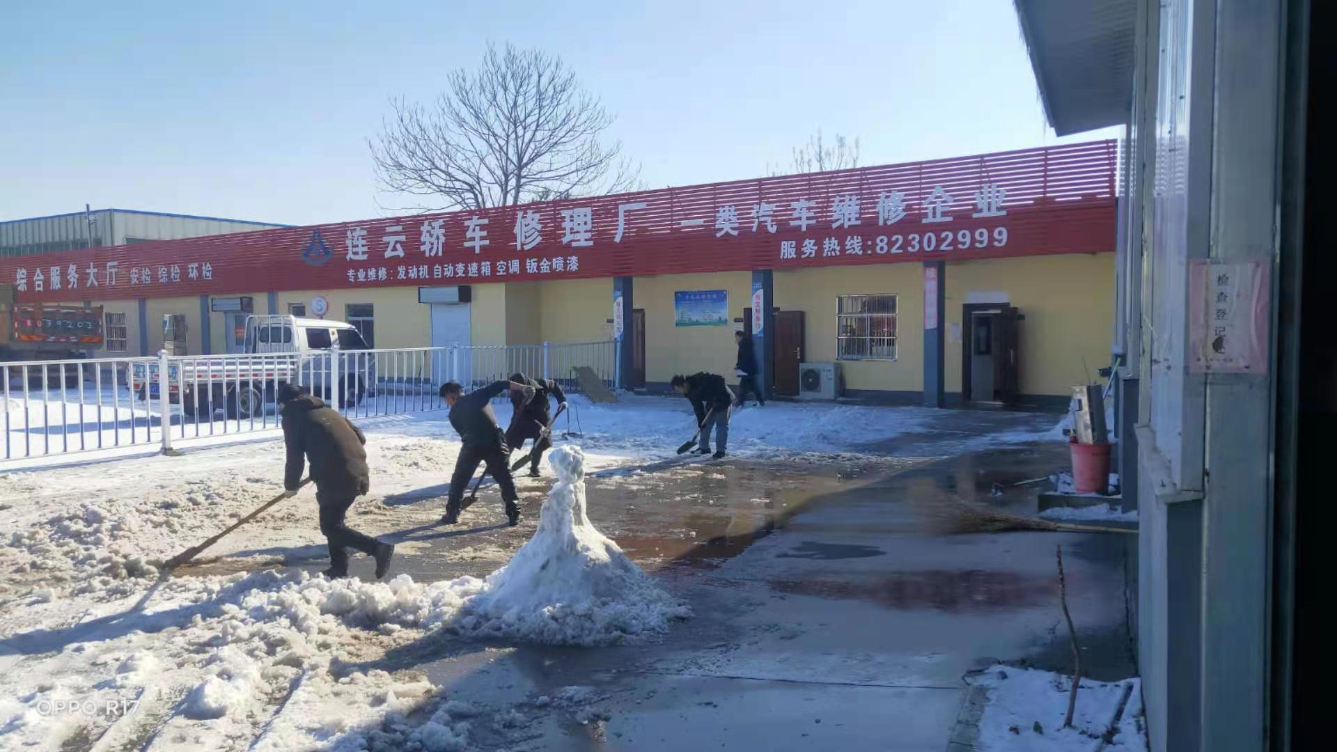受強冷空氣影響,12月29日,連云港市迎來了一場突如其來的大雪。根據(jù)集團和上級公司有關(guān)低溫雨雪冰凍天氣安全工作精神,30日上午一上班,修理事業(yè)部各公司就紛紛展開積雪清掃活動。在清掃隊伍中,有公司領(lǐng)導(dǎo)、有勞模、有黨員、有普通職工。大家利用各種工具,對各自轄區(qū)的積雪進行了認(rèn)真清理。經(jīng)過一夜的低溫,雨雪已經(jīng)結(jié)冰,對清掃工作造成很大的難度,積雪清掃效果并不理想。下午時分,氣溫有所提升,部分積雪已經(jīng)融解,事業(yè)部各單位又紛紛行動,繼續(xù)展開積雪清掃活動。隨著時間的推移,在大家的努力下,地面冰雪一點點得到清理,逐步清理出一條便于車輛和行人出行的干凈路面。