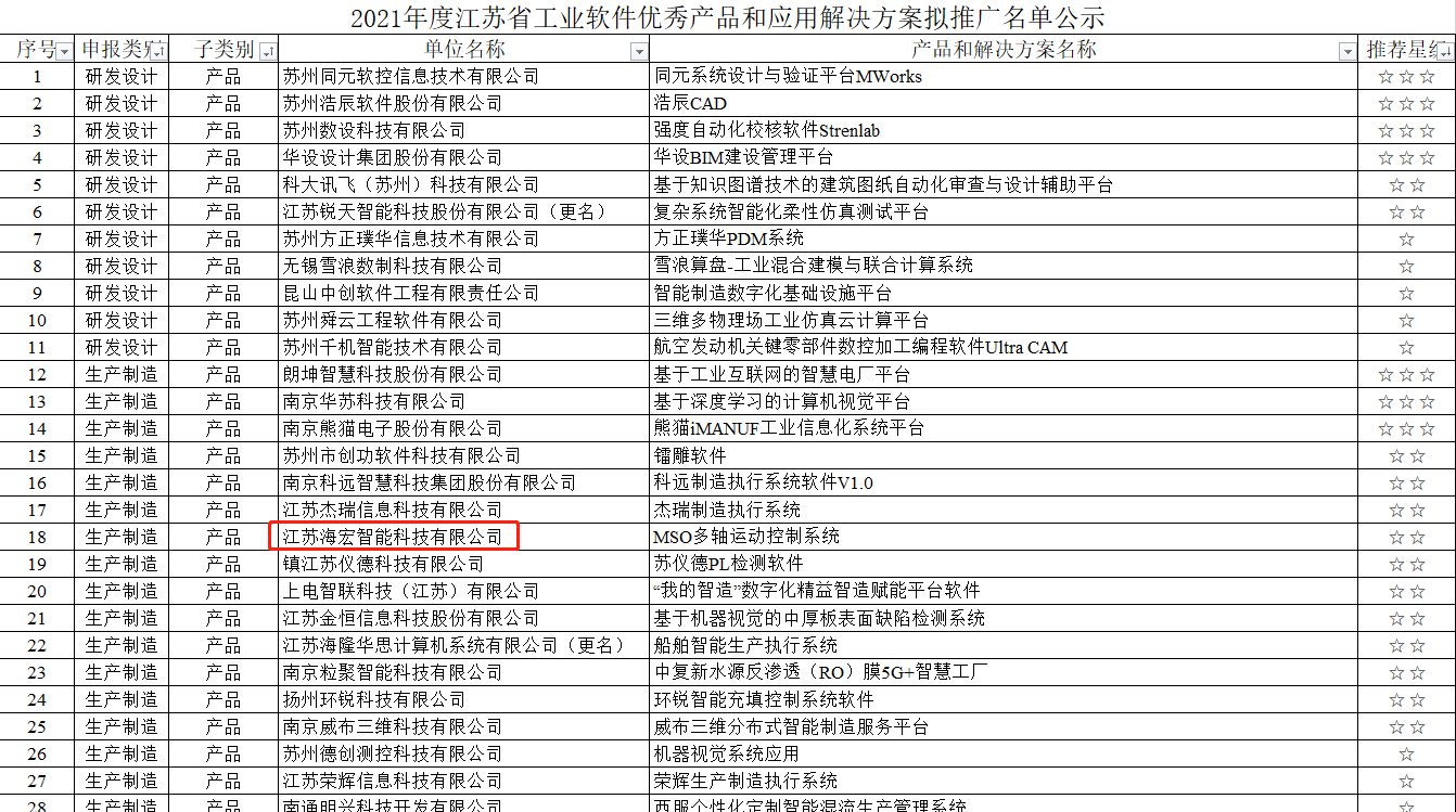 日前,江蘇省工信廳公示了“2021年度江蘇省工業(yè)軟件優(yōu)秀產(chǎn)品和應(yīng)用解決方案擬推廣名單”,江蘇海宏智能科技有限公司(以下簡稱“海宏科技”)的產(chǎn)品“MSO多軸運(yùn)動(dòng)控制系統(tǒng)”成功入選。